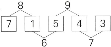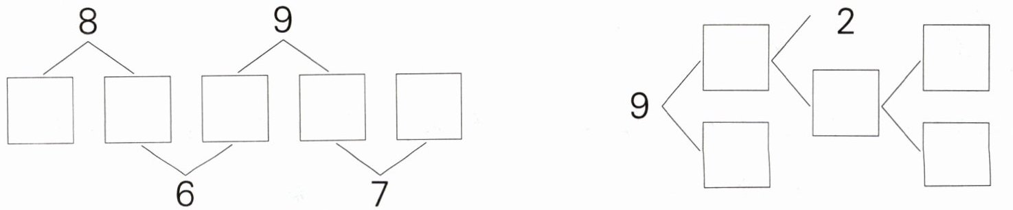 [解析]可以采用推理、尝试的方法解决问题。左图可以从较小的数入手,6可以分成1和5、2和4、3和3,任取一组数填在□中,再推理出其他□里要填的数。右图可以从最右边的两个□入手,从较小的数开始尝试,如3和2合起来是5,5与2合起来是7,7与2合起来是9,即依次推理出其他□里要填的数。