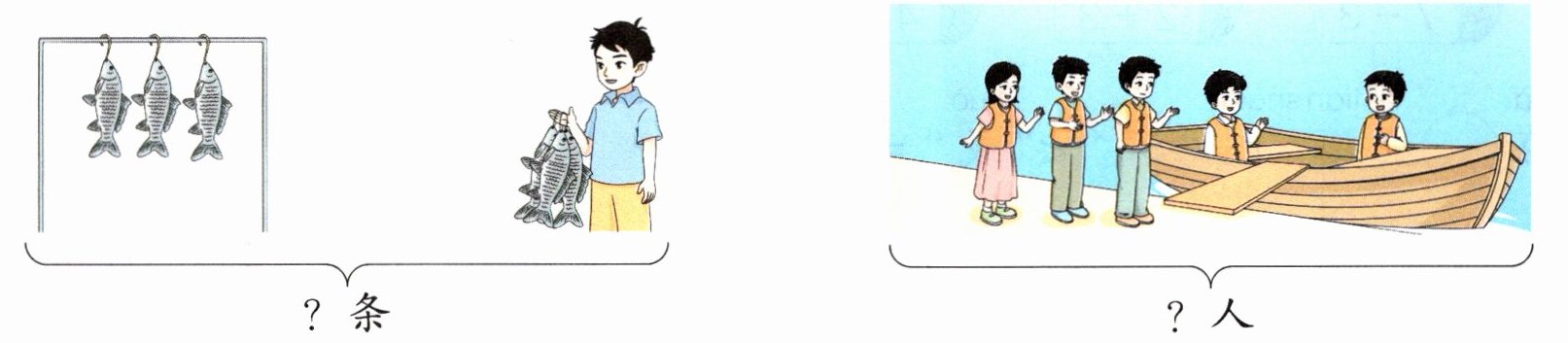 图中左边架子上挂着$3$条鱼,右边小朋友手里拿着$4$条鱼,求一共有多少条鱼,用加法计算,可列出算式: