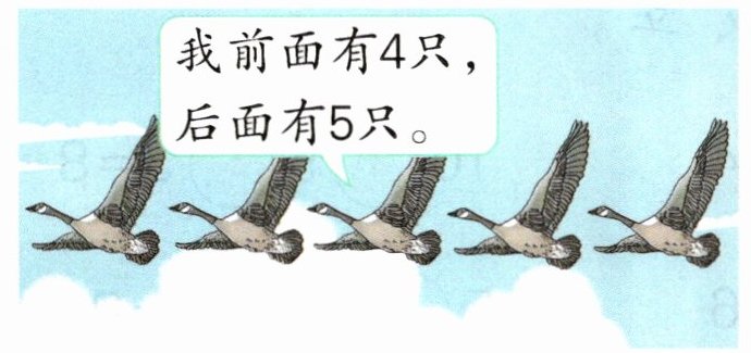 4+5+1=10 【解析】图中一只大雁的前面有4只,后面有5只,它的前后一共有4+5=9(只),还要加上表示这只大雁的1,列连加算式为4+5+1=10(只)。