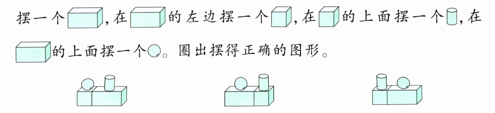 圈第3个。 [解析]第1个图形中,圆柱和球的位置放反了;第2个图形中,正方体在长方体的右边,不正确;第3个图形正确,应圈第3个。