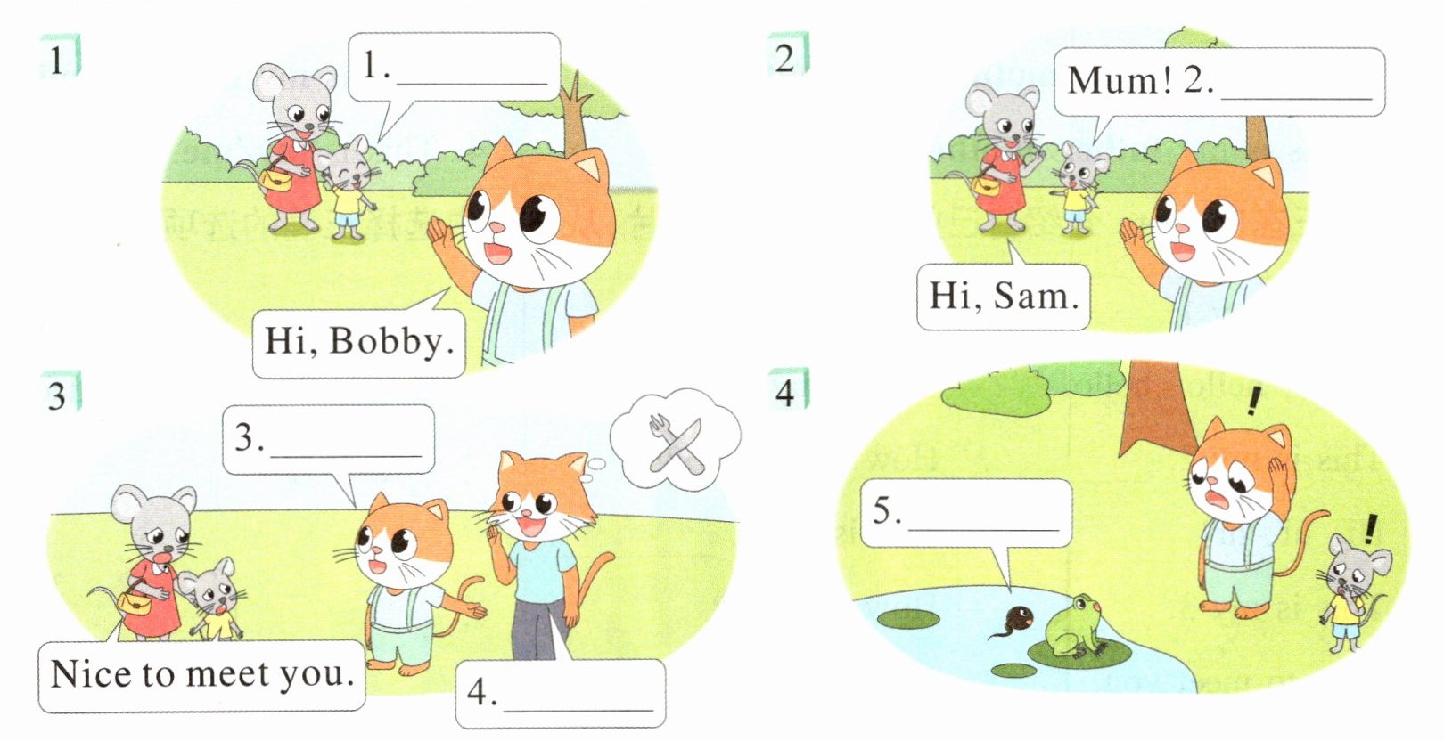 三、小猫 Sam 在公园遇到小老鼠 Bobby。选择正确的选项将故事补充完整。