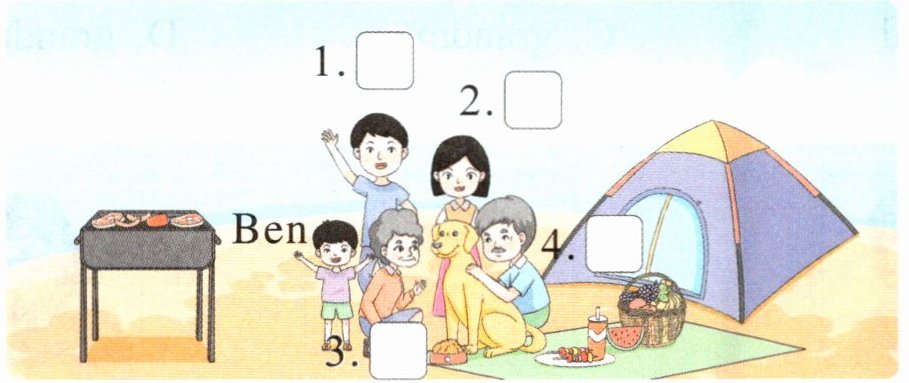 一、看看 Ben 一家的野餐照片,选择合适的选项填入方框中,帮 Ben 完成家人的介绍吧。