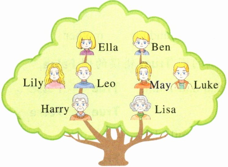 三、新趋势 多模态 仔细观察家庭树,判断每个人的描述是(√)否(×)正确。