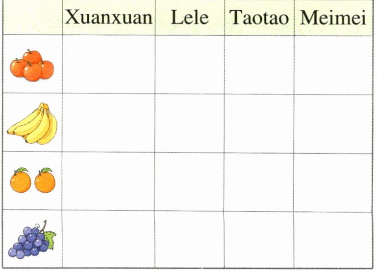 Xuanxuan:苹果;Lele:香蕉 Taotao:橙子;Meimei:葡萄