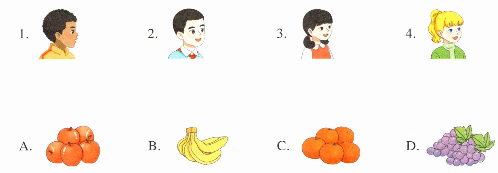 三、Miss White 正在带领同学们采摘水果。听一听,将人物与喜欢的水果连线。