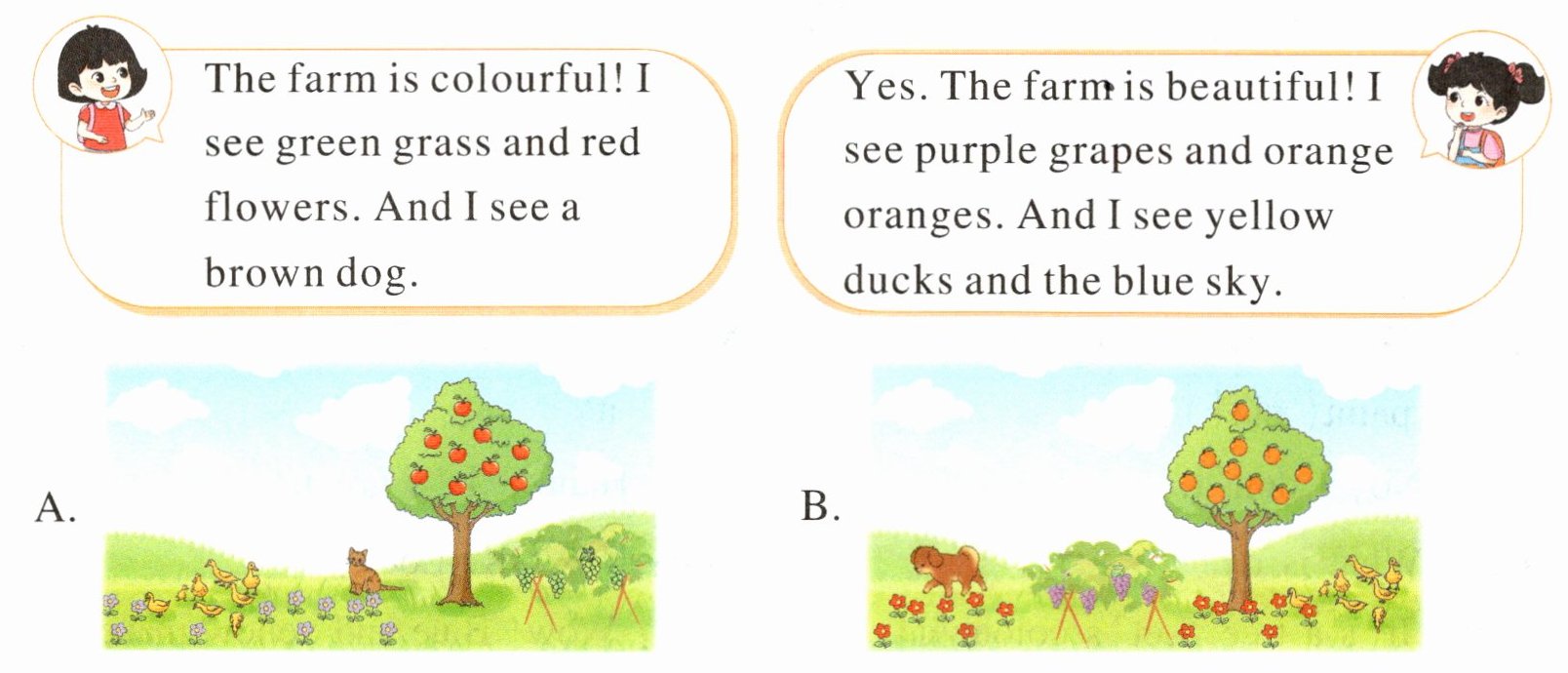 Yes. The farm is beautiful! I see purple grapes and orange oranges. And I see yellow ducks and the blue sky.