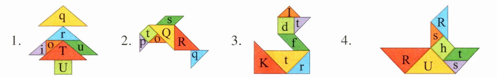 一、新趋势 新题型 读一读,圈出各七巧板中相同的字母并在四线三格上写出其大小写形式。
