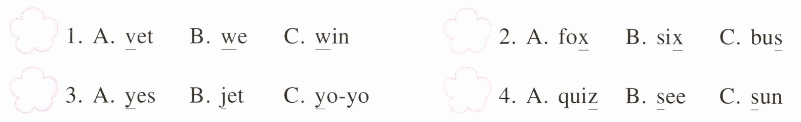 三、读一读,根据图片提示,选择正确的字母补全单词。