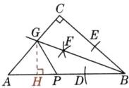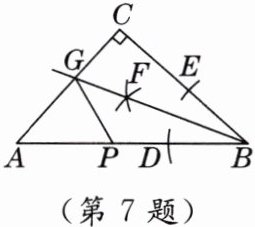 7. 如图,在 $ Rt \triangle ABC $ 中,$ \angle C = 90^{\circ} $,利用尺规在 BC,BA 上分别截取 BE,BD,使 $ BE = BD $;分别以 D,E 为圆心,以大于 $ \frac{1}{2}DE $ 的长为半径作弧,两弧在 $ \angle CBA $ 内交于点 F;作射线 BF 交 AC 于点 G. 若 $ CG = 1 $,P 为 AB 上一动点,则 GP 的最小值为( )