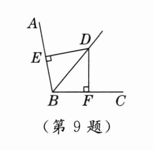 9. 如图,$ DE \perp AB $ 于点 E,$ DF \perp BC $ 于点 F,且 $ DE = DF $,若 $ \angle DBC = 50^{\circ} $,则 $ \angle ABC = $