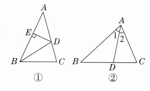 (2)【证明】如图②,过点 D 作 DM⊥AB 于点 M,DN⊥AC 于点 N,过点 A 作 AE⊥BC 于点 E,则$S_{△ABD}$= $\frac{1}{2}$AB·DM= $\frac{1}{2}$BD·AE,$S_{△ACD}$= $\frac{1}{2}$AC·DN= $\frac{1}{2}$CD·AE.