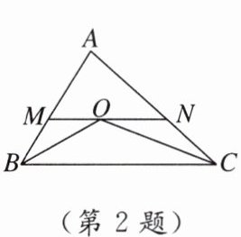 2. 如图,$\triangle ABC$中,$BO平分\angle ABC$,$CO平分\angle ACB$,$MN经过点O$,与$AB$,$AC相交于点M$,$N$,且$MN// BC$,已知$AB = 3$,$AC = 4$,则$\triangle AMN$的周长为(