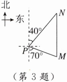 3. 如图,一艘海轮位于灯塔$P的南偏东70^{\circ}方向的M$处,它以每小时40海里的速度向正北方向航行,2小时后到达位于灯塔$P的北偏东40^{\circ}方向的N$处,则$N处与灯塔P$相距(