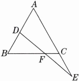 2. 如图,点 $ E $ 在 $ \triangle ABC $ 的边 $ AC $ 的延长线上,点 $ D $ 在 $ AB $ 边上,$ DE $ 交 $ BC $ 于点 $ F $,$ DF = EF $,$ BD = CE $。求证:$ \triangle ABC $ 是等腰三角形。