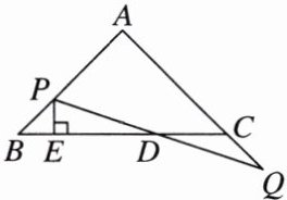 3. 新视角 动点探究题 如图,在 $ \triangle ABC $ 中,$ AB = AC $,点 $ P $ 从点 $ B $ 出发沿线段 $ BA $ 移动,同时,已知点 $ Q $ 从点 $ C $ 出发沿线段 $ AC $ 的延长线移动,点 $ P $,$ Q $ 移动的速度相同,$ PQ $ 与直线 $ BC $ 相交于点 $ D $。