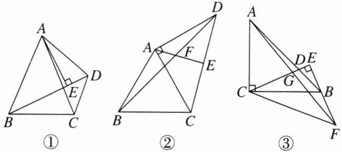 (1) 如图 ①,在 $ \triangle ABC $ 中,$ AB = AC $。点 $ D $ 在 $ \triangle ABC $ 外,连接 $ AD $,$ BD $,$ CD $,且 $ \angle BDC = \angle BAC $。过 $ A $ 作 $ AE \perp BD $ 于点 $ E $,则线段 $ BE $,$ CD $,$ DE $ 之间满足的数量关系是______;