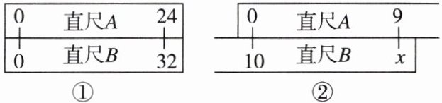 4. 新考向 传统文化 秦始皇统一度量衡意义重大,这一举措极大地方便了生产与生活. 如图①和图②,欣欣通过对比两把不同刻度的直尺说明了其中的原因,并进行如下探究:将两把直尺有刻度的一侧紧贴,则由两幅图可得方程为(