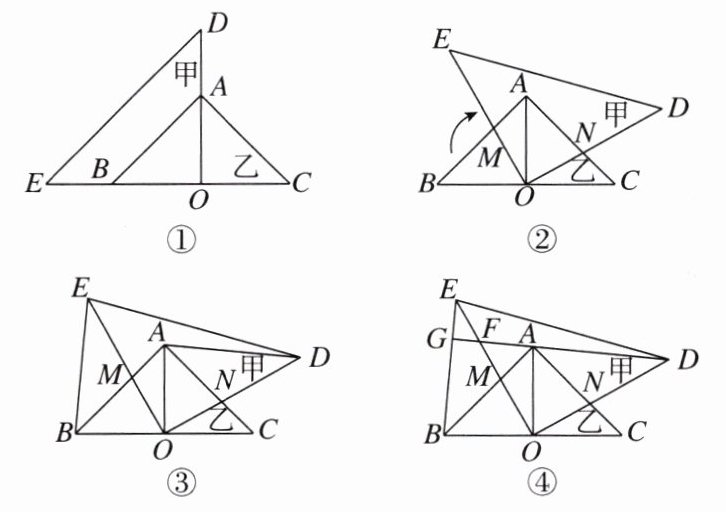 (3) 延长$DA分别交OE$,$BE所在直线于点F$,$G$,如图④,猜想并证明$DG与BE$的位置关系.