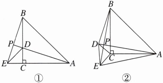 7. 如图①,在$△ABE$中,$BC⊥AE于点C$,$BC = AC$,在$BC上截取CD = CE$,连接$AD$,$DE$,直线$AD交BE于点P$.