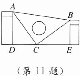 11. 如图,课间小林拿着老师的等腰直角三角板玩,不小心掉到两个凳子之间(凳子与地面垂直),已知$DC = 55\mathrm{cm}$,$CE = 75\mathrm{cm}$,则两个凳子的高度之和为