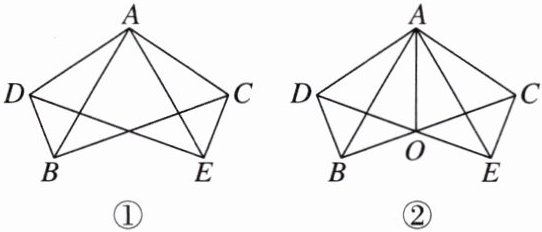 (2)如图②,设$BC与DE交于点O$,连接$AO$,在不添加任何辅助点的情况下,请直接写出图中所有的全等三角形(不包含(1)中的全等三角形)。