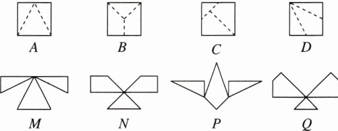 3. 母题 教材P42练习T1 如图,将标号为 $ A $,$ B $,$ C $,$ D $ 的正方形沿图中的虚线剪开后,得到标号为 $ M $,$ N $,$ P $,$ Q $ 的四组图形,填空: