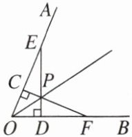 10. 如图,小颖同学想画 $ \angle AOB $ 的平分线,可忘了带量角器和圆规,只有一个带刻度的直角三角尺,于是她做了如下操作:在 $ OA $,$ OB $ 边上量取 $ OC = OD = 2\ cm $,分别过点 $ C $,点 $ D $ 作 $ CF \perp OA $,$ DE \perp OB $,$ CF $ 与 $ DE $ 交于点 $ P $,作射线 $ OP $,则射线 $ OP $ 就是 $ \angle AOB $ 的平分线。请判断小颖的做法是否可行?并说明理由。