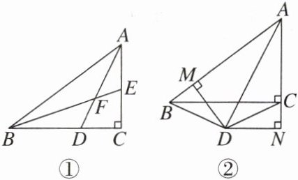 (1) 如图 ①,当点 $ D $ 在线段 $ BC $ 上时,$ BE $ 平分 $ \angle ABC $,分别交 $ AC $,$ AD $ 于点 $ E $,$ F $,求 $ \angle BFD $ 的度数。