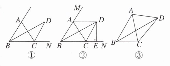 (2) 如图 ②,当点 $ D $ 在 $ \triangle ABC $ 的外部时,过点 $ D $ 作 $ DM \perp AB $,交 $ AB $ 于点 $ M $,$ DN \perp AC $,交 $ AC $ 的延长线于点 $ N $,且 $ BM = CN $。