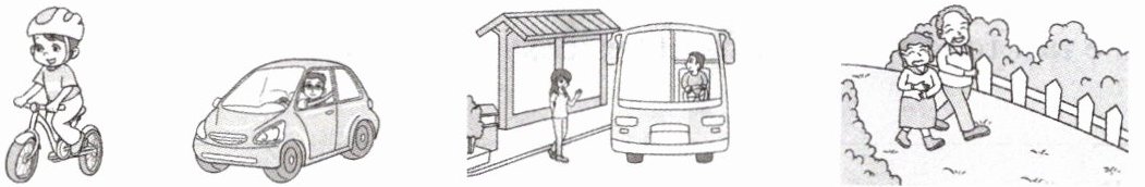 1. by bike 2. by car 3. takes the bus 4. on foot