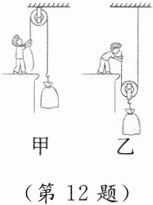 12. 劳动教育课上,老师带领同学们亲身感受了机械对工程人员的助力。如图所示,小明分别用甲、乙两个滑轮把同一袋沙从地面提到二楼,用甲滑轮所做的总功为$W_{1}$、机械效率为$\eta_{1}$;用乙滑轮所做的总功为$W_{2}$,机械效率为$\eta_{2}$。若不计绳重与摩擦,则(