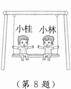 8. 如图所示,小桂和小林一起坐在秋凳上荡秋千,他们的重力分别是$G_{1}$、$G_{2}$,且$G_{1} < G_{2}$,某次从最高点下摆到最低点的过程中,他们重力做功的大小分别为$W_{1}$、$W_{2}$,重力做功的快慢分别为$P_{1}$、$P_{2}$。则(