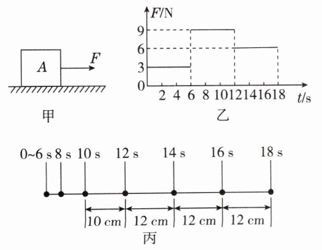 10. 图甲中,物块$A在水平拉力F$的作用下,从静止开始,沿粗糙程度均匀的水平面向右运动,拉力$F随时间t$变化的关系如图乙。图丙是从$t = 0开始每隔2\ s记录一次物块A$的位置,下列说法正确的是(