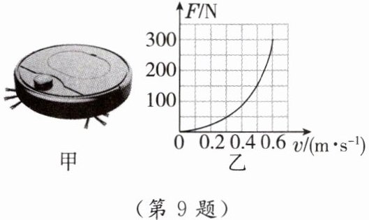 9. [2024·南通模拟]地面清洁机器人在严峻的卫生防疫工作中发挥了重要作用。如图甲所示的地面清洁机器人,质量为$3\ kg$,机器人在水平地面运动时,所提供的推力与速度的关系如图乙所示,则该机器人在水平地面上以$0.5\ m/s$的速度匀速直线运动时,水平推力的功率是(