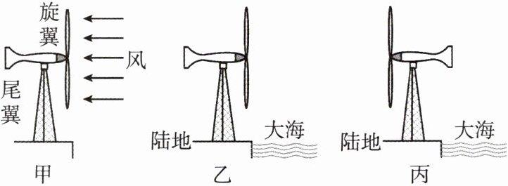 6. 跨学科 学科综合 家用小型风力发电机独特的尾翼结构,能使其旋翼自动迎风,如图甲所示。海边,仅在海陆风因素的影响下,图乙、图丙所示的情形通常分别发生在(