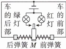 绿灯;红灯 [点拨]当汽车启动时,金属滑块由于惯性保持静止状态,使绿灯接入电路,绿灯通电而亮;当汽车急刹车时,金属滑块由于惯性保持运动状态,使红灯接入电路,红灯通电而亮。