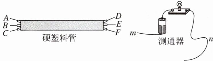 15. 如图,在一根横跨河流两岸的硬塑料管内穿有三根完全相同的电线,为了辨别哪两个线头为同一根导线的两端,可以用图示的测通器来测试,其操作过程如下:连接A和B,将测通器的m连接在D上。当n连接E时小灯泡发光,连接F时小灯泡不发光。由此可以确定____