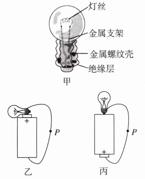 B [点拨]用一节干电池、一段导线将小灯泡连接入电路中,电流从电池的正极流出通过小灯泡、导线流回电池的负极,就可以点亮小灯泡。图乙中,螺纹壳与电源的正极相连接,负极通过导线也与螺纹壳相连,形成了短路;图丙中,小灯泡的一个接触点(顶点)与电池的正极接触,另一个接触点(螺纹壳)与电池的负极用导线连接,形成闭合通路,小灯泡会发光,故B正确,A、C错误;由于图乙处于短路状态,电流不会通过灯泡,若在P点接上一个开关,小灯泡也不能发光,故D错误。