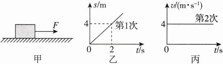 =;< 【点拨】由图乙、丙可知,木块两次均做匀速直线运动,受到的拉力和滑动摩擦力是一对平衡力,所以$F_{1}=F_{2}$。由图乙可知,第一次木块运动的速度为$v=\frac{s}{t}=\frac{4\ m}{2\ s}=2\ m/s$,由图丙可知,第二次木块运动的速度为4 m/s,第二次速度较大,根据$P=\frac{W}{t}=\frac{Fs}{t}=Fv$可知,两次拉力的功率大小关系为$P_{1}<P_{2}$。