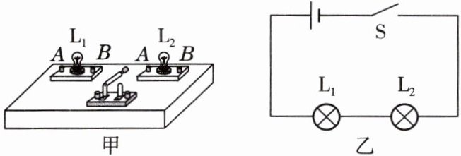 ①小明连接好如图乙所示电路后,闭合开关 $ S $,他发现 $ L_{1}、L_{2} $ 两只小灯泡都不亮,他用手按一下小灯泡 $ L_{1} $,$ L_{1}、L_{2} $ 仍然都不亮,按一下小灯泡 $ L_{2} $,两只小灯泡都亮,松开手两只小灯泡又不亮,则故障可能是