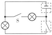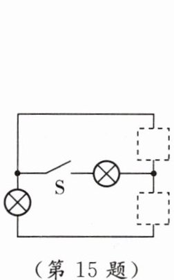 15. 请在图中的两个虚线框内填“电源”和“开关”的电学元件符号,并满足当开关都闭合时两灯组成并联电路。