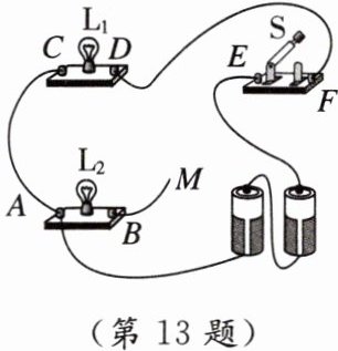 13. [2025·石家庄月考] 如图所示是小刚在连接电路时的情景,若要使 $ L_{1} $ 和 $ L_{2} $ 两只灯泡并联,开关 $ S $ 同时控制两灯,则线头 $ M $ 应接在