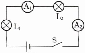 9. (新考法 分析解释)在“用电流表测电流”的实验中,小王同学设计的电路如图所示,闭合开关后,发现电流表 $A_{1}$ 的示数比电流表 $A_{2}$ 的示数要大一些。于是他猜想:当电流通过灯泡时,由于灯泡要消耗电能,所以电流在流动过程中将逐渐变小。