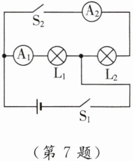 C [点拨]观察电路图可知:L₁与L₂并联,A₁测通过L₁的电流,A₂测通过L₂的电流,S₁在干路上,S₂在L₂所在支路上。只闭合S₁时,L₁发光、L₂不发光;只闭合S₂时,L₁、L₂均不发光;闭合S₁、S₂时,L₁、L₂并联,A₂测通过L₂的电流。