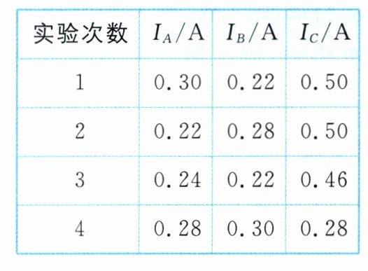 的电流。(2) 该小组同学换用不同规格的小灯泡进行实验,用电流表多次测 $A$、$B$、$C$ 三点电流,记录实验数据如下表。