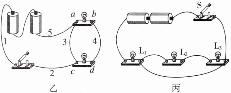 (2)根据图乙可知,拆除3这一根导线,电流从电源正极依次经过两个灯泡回到电源负极,则两灯串联连接;若要两灯并联,可将导线2改接到b(或d)接线柱,或者将导线5改接到b(或d)接线柱(选其中一种组合即可)。