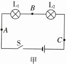 (1)小明按照图甲连接串联电路时,开关应______(填“断开”或“闭合”);连接完成后,小明将一根导线连接在图甲中 $ A $、$ B $两点上,闭合开关,则可以观察到的现象是灯泡 $ L_1 $______,$ L_2 $______(后两空均填“发光”或“不发光”)。