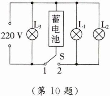 10. [2025·河池模拟]如图所示是一款消防应急照明灯简化原理图,有两个应急灯泡 $ L_1 $、$ L_2 $,当外部电源供电时,自动开关 $ S $接1,应急灯不亮,蓄电池此时在电路中相当于