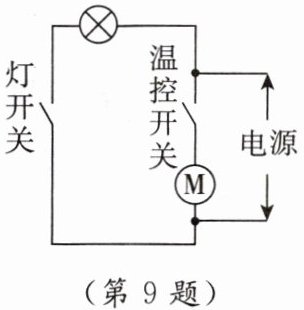 9.BCD 【点拨】由图可知,温控开关闭合,电动机工作;灯开关闭合,照明灯工作;电动机和照明灯工作过程互不影响,所以是并联;关上冰箱门时,灯开关自动断开,没有电流通过照明灯,照明灯熄灭;冰箱内温度降低到设定温度时,温控开关自动断开,电动机停止工作;电动机和照明灯是并联的,当两个开关同时闭合时,可以同时工作。