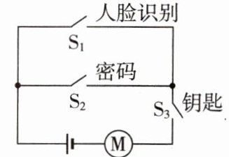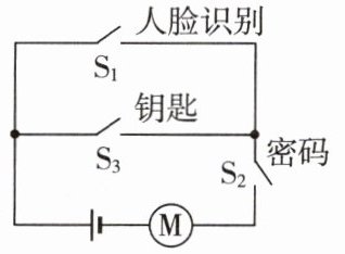 7. [2024·湖南]科技小组模拟“智能开锁”设计的电路图,有两种开锁方式,即“人脸识别”与输入“密码”匹配成功,或“人脸识别”与使用“钥匙”匹配成功才可开锁。现用 $ S_1 $表示人脸识别,$ S_2 $、$ S_3 $表示密码、钥匙。匹配成功后对应开关自动闭合,电动机才工作开锁。满足上述两种方式都能开锁的电路是(